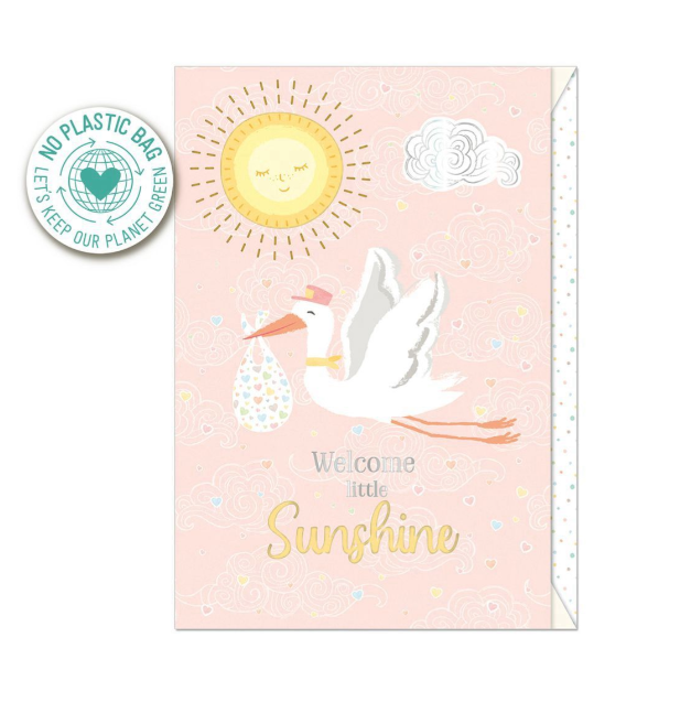 Biglietto doppio + busta augurale Nascita Cicogna Rosa