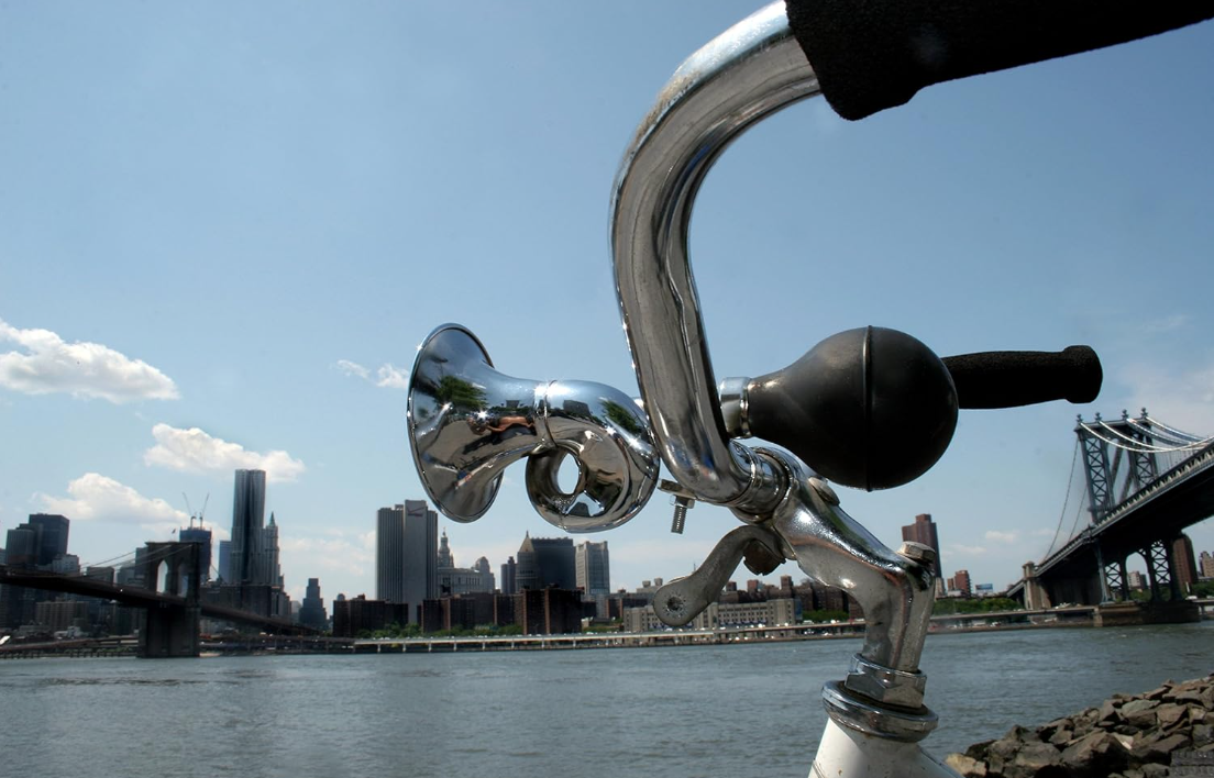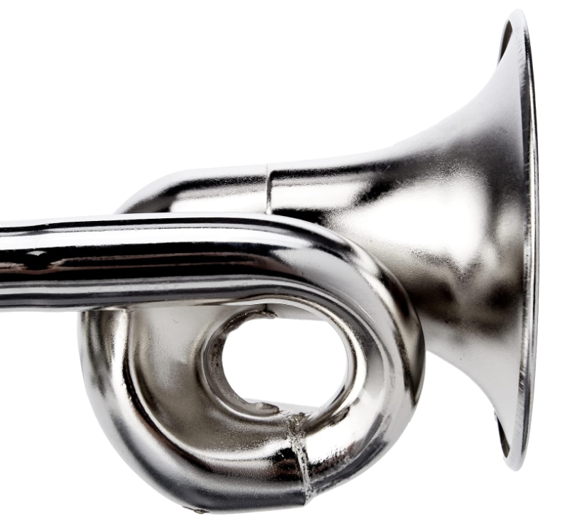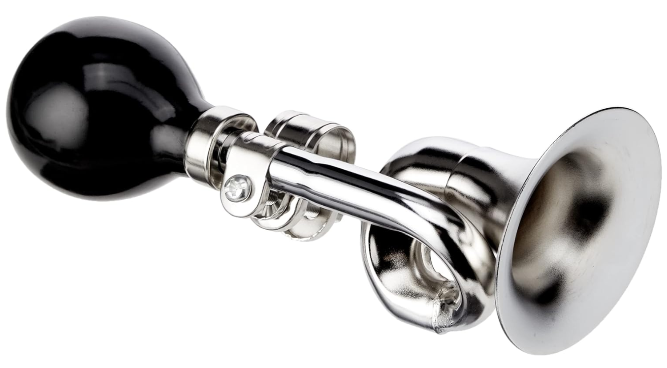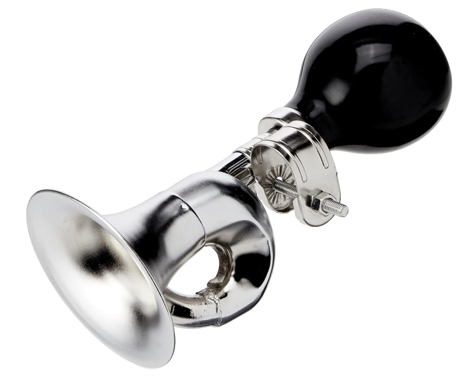 Il clacson per bicicletta Bugle è un modello americano con parti in acciaio cromato e bulbo in gomma morbida.