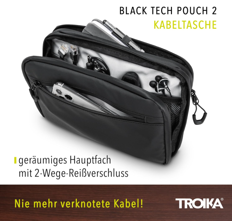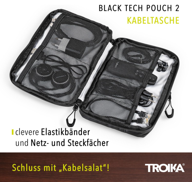 PER TUTTO CIÒ CHE DI ANALOGICO C'È NEL MONDO DIGITALE. Borsa de cavi per gli accessori elettronici. Finalmente niente più cavi aggrovigliati! Con la TROIKA BLACK TECH POUCH 2, potrete portare con voi i vostri accessori elettronici in modo ordinato e non dovrete più districarli per ore e ore. Un numero sufficiente di scomparti offre spazio per adattatori, cuffie, cavi di ricarica. - Cerniere idrorepellenti.
