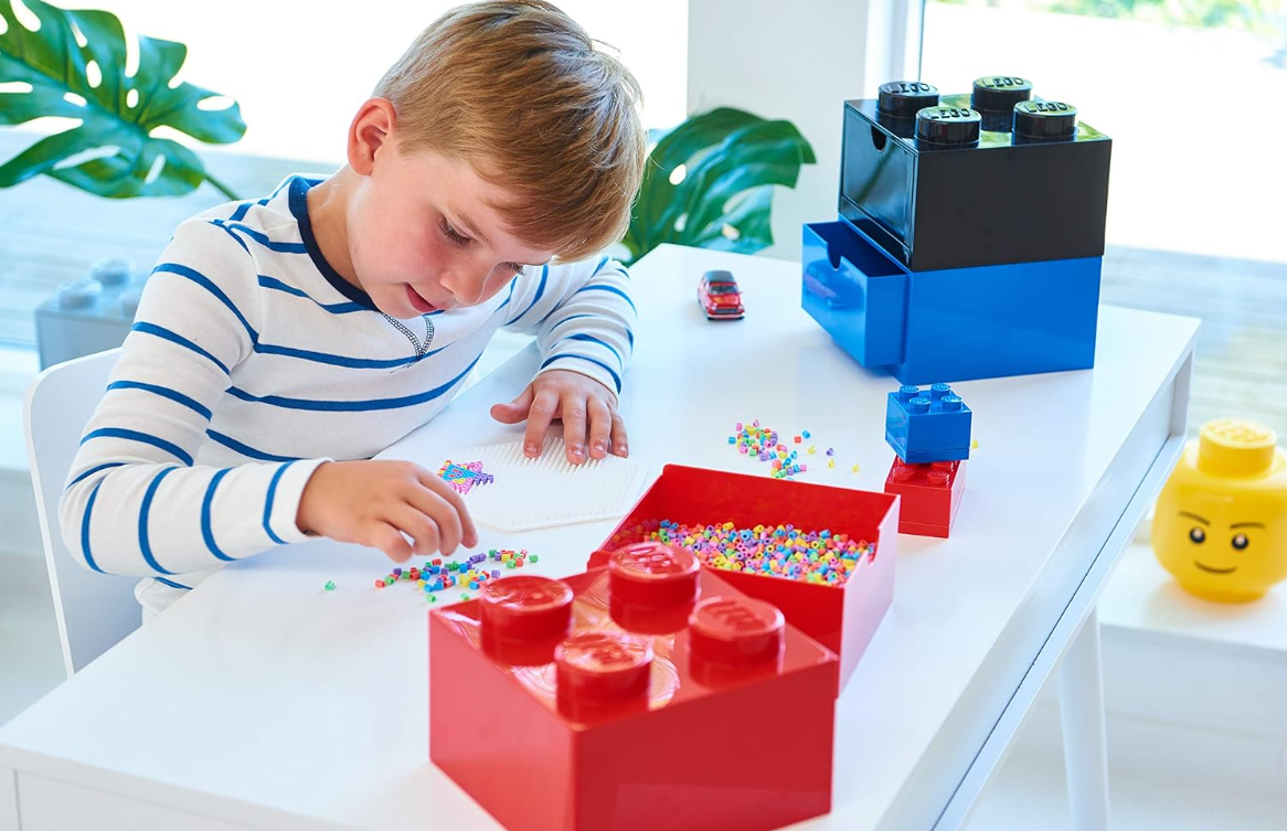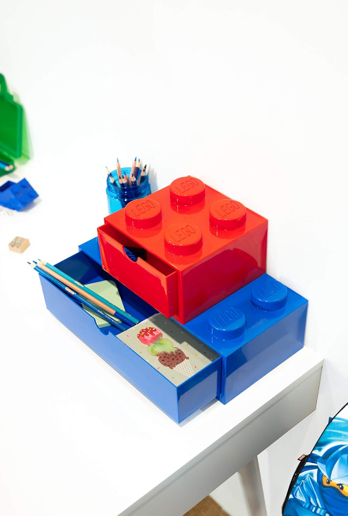 Impilabile come i mattoncini LEGO®: grazie ai 4 bottoncini LEGO in cima al contenitore, ciascun cassetto-mattoncino può essere facilmente combinato ad altri per creare un sistema di contenitori impilati