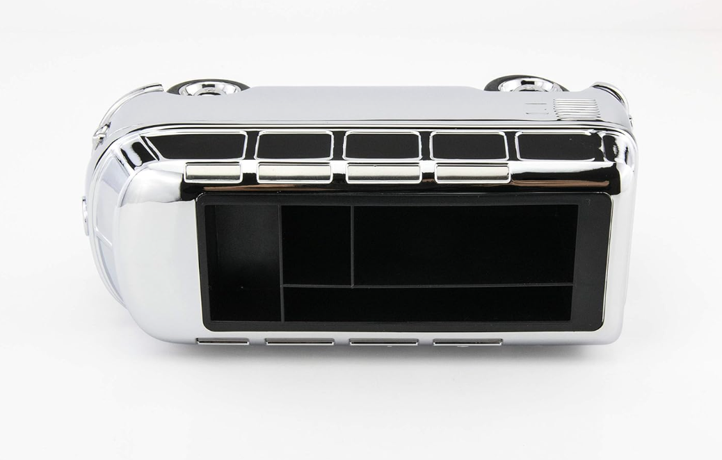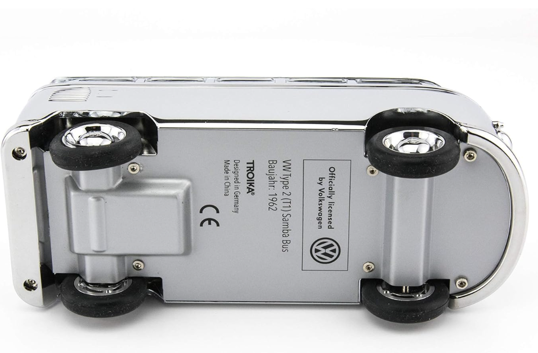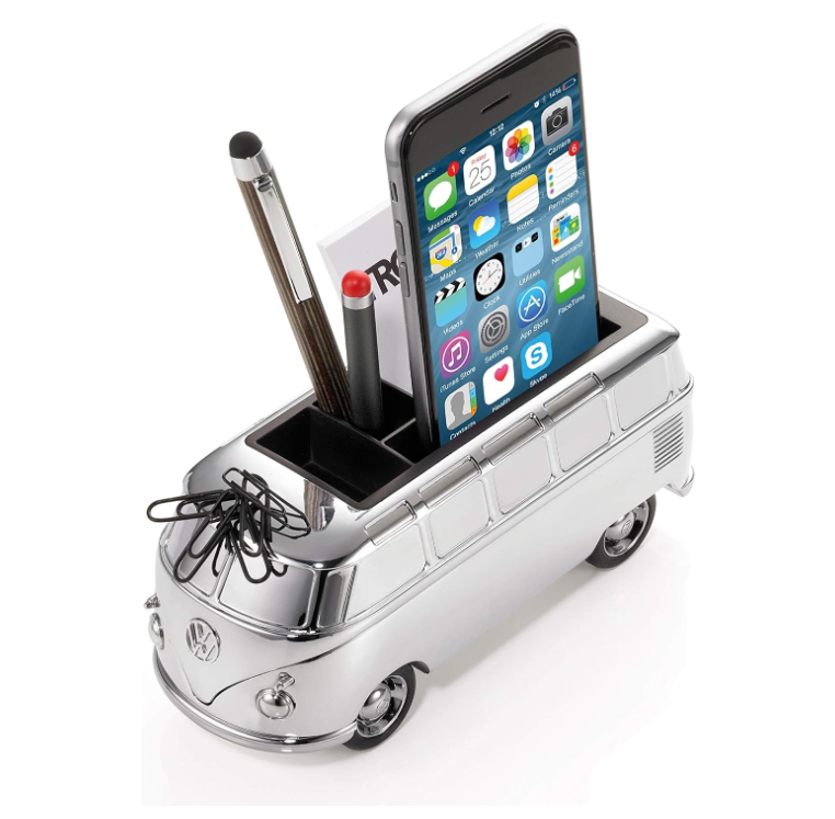Questo elegante organizer da scrivania Troika® a forma di VW Samba Bus T1 è perfetto per tenere in ordine i tuoi accessori da scrivania. Con il suo design ispirato al celebre Bulli e il suo motore a retro carica, è anche un oggetto decorativo. Include anche un vano per smartphone, biglietti da visita e una testata per clip magnetica. Realizzato in metallo pressofuso cromato lucido, è disponibile nel colore argentato.