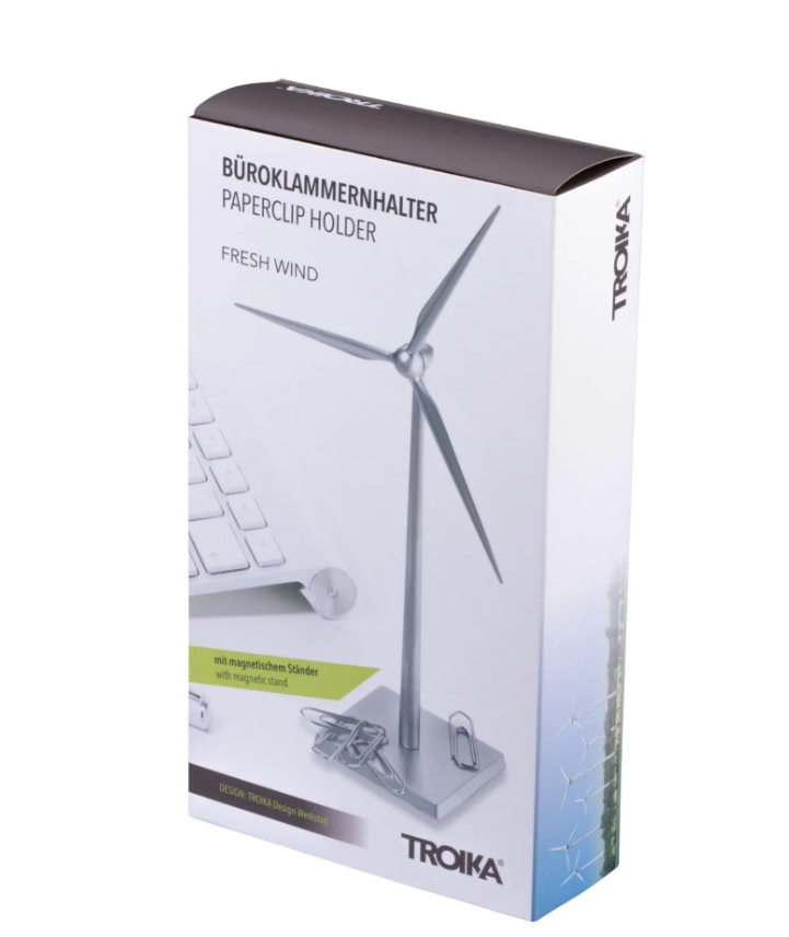 L'energia alternativa è enorme e l'energia eolica è un modo per ridurre le emissioni di CO2. Alcune delle più grandi aziende di ingegneria del mondo come Siemens, Vestas, GE, Enercon e Nordex stanno costruendo mulini a vento sempre più grandi e potenti. Troika ha progettato la sua turbina eolica, Fresh Wind, per la tua scrivania. Catturando la semplice eleganza dei moderni mulini a vento, ha una struttura completamente in metallo e presenta una base magnetica perfetta per tenere le graffette.