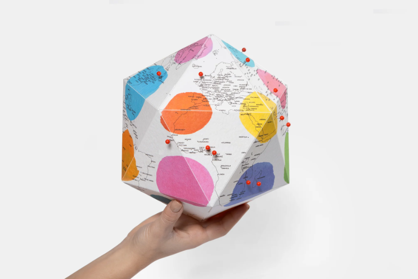 A prima vista, Here Illustrated sembra un planisfero bidimensionale, ma in pochi secondi si trasforma invece in un globo tridimensionale!