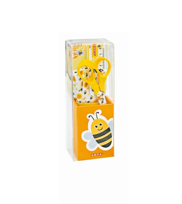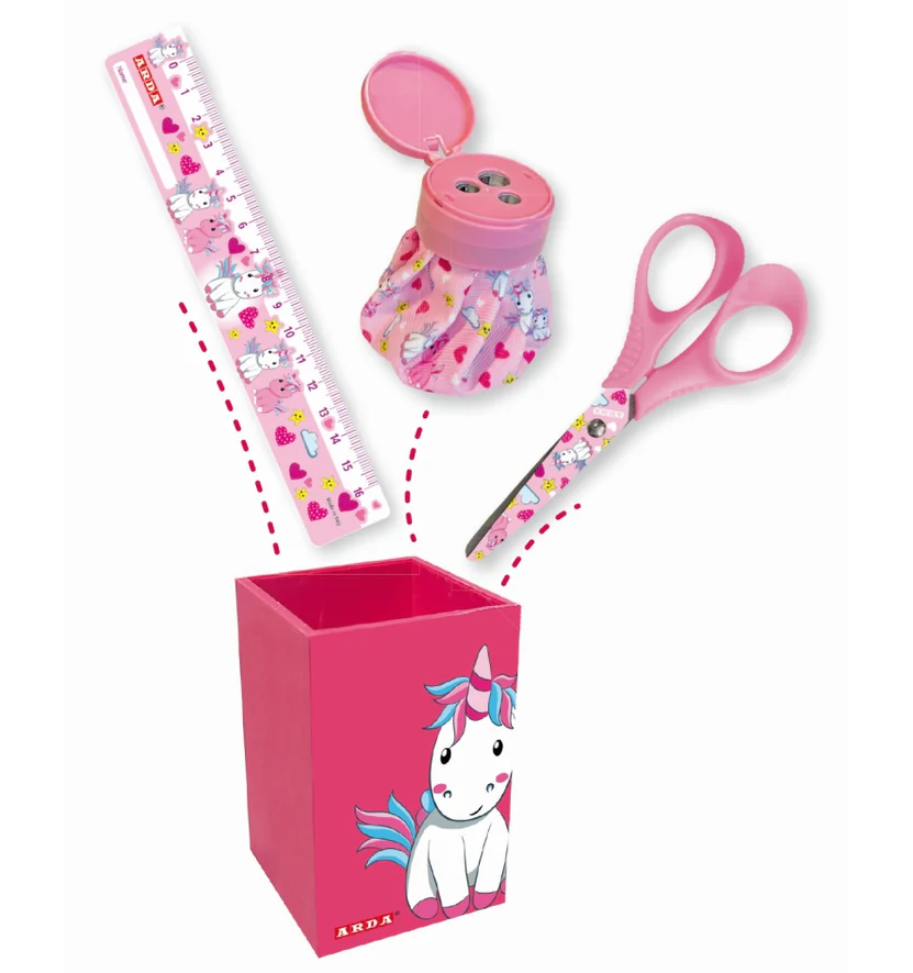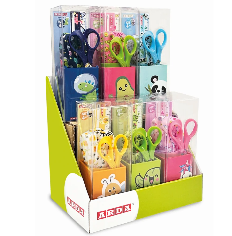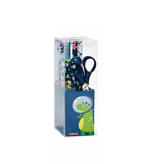 Il kit scuola Fancy è una soluzione pratica e colorata per accompagnare bambini e ragazzi nelle attività scolastiche quotidiane. Ogni confezione è composta da quattro articoli coordinati: un bicchiere portapenne con grafica decorata, un righello da 16 cm, una forbice in acciaio inox da 13 cm e un temperamatite modello Tenks in metallo con 3 fori e serbatoio in stoffa. Tutti i pezzi sono decorati con soggetti allegri e vivaci, disponibili in sei varianti assortite che includono animali e frutti in stile cartoon.