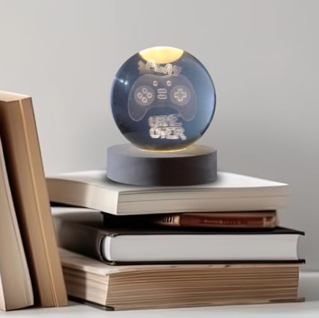 Acquista la lampada da notte I-TOTAL® per un'esperienza magica. Con una sfera di vetro 3D e LED RGB, proietta un incantevole effetto sul soffitto. La serigrafia interna si illumina completamente in fasci di luce multicolore. La luce notturna è perfetta per i bambini, con base in legno e un tema fantasy decorativo. Un'originale decorazione in cristallo con il disegno della GAMING.
