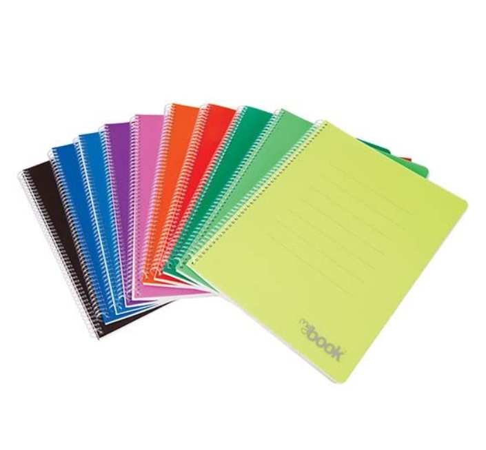 Maxi quaderno con spirale senza fori archivio composto da 80 ff con microperforazione, grammatura da 70gr. Copertina e retroblocco in polipropilene 500my, spirale in plastica trasparente riciclabile. Colori neon trasparenti assortiti, formato A4, 5 mm.