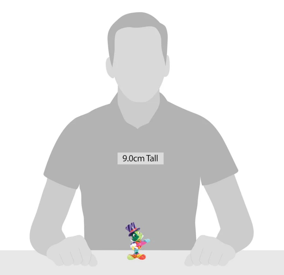 "Tra i personaggi più preziosi di Disney, il Grillo Parlante è stato la coscienza e la guida di Pinocchio nella sua ricerca di diventare un vero ragazzo. Ogni figura di Disney by Britto, decorata in stile pop art dall'artista internazionale Romero Britto, è realizzata in resina dipinta a mano con finitura laccata lucida. Confezionato in una scatola regalo. Queste figure non sono giocattoli per bambini. Destinato solo agli adulti".