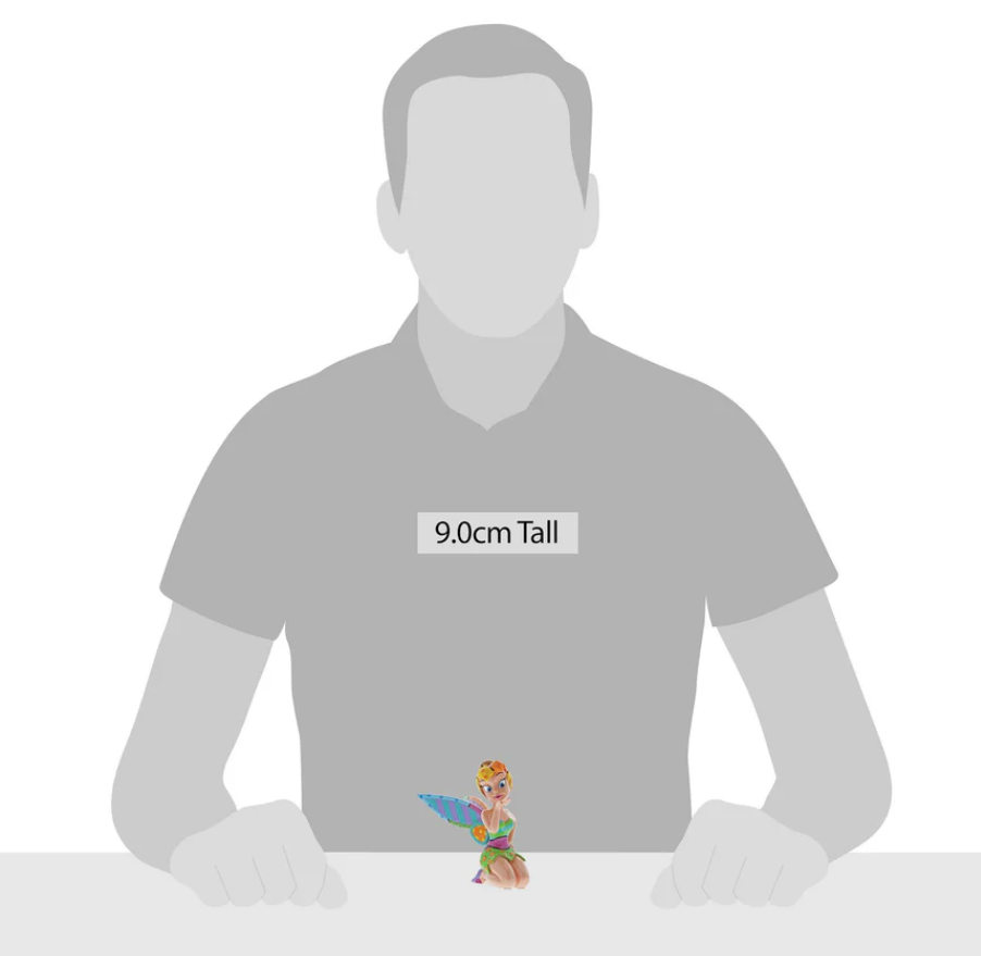 "Questa vivace miniatura di Campanellino mostra la compagna di Peter Pan in ginocchio che sparge un po' di magia con la sua polvere magica. Ogni statuetta di Disney by Britto, decorata in stile pop art dall'artista internazionale Romero Britto, è realizzata in resina dipinta a mano con finitura laccata lucida. Confezionata in una scatola regalo. Queste figure non sono giocattoli per bambini. Sono destinate solo agli adulti".