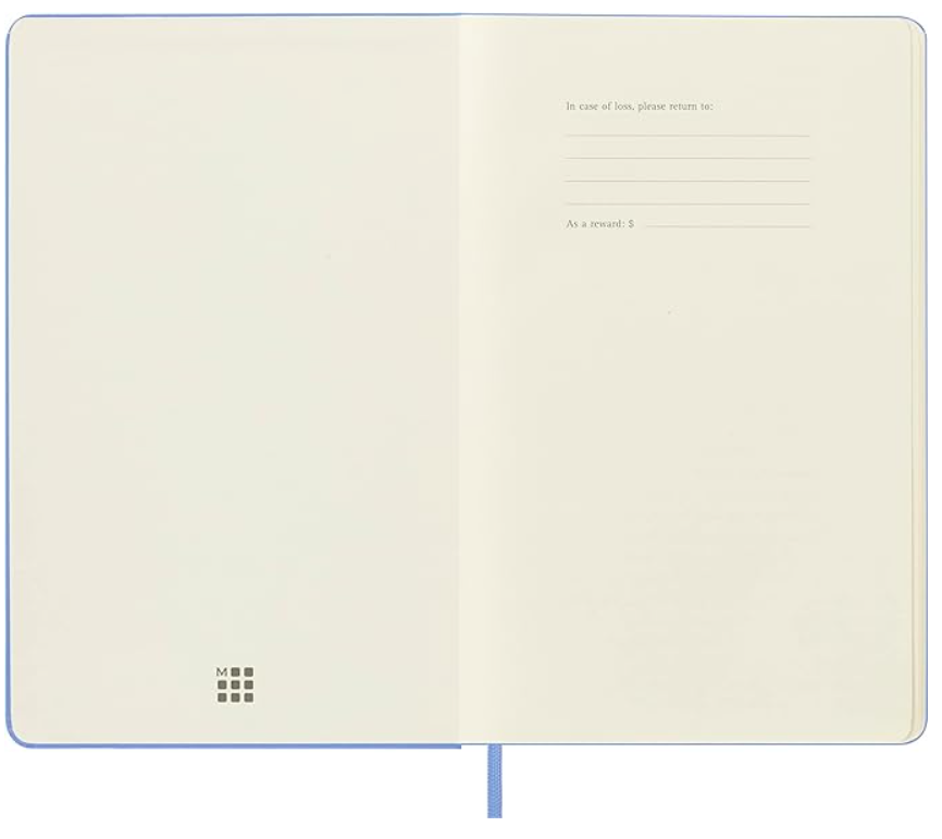 Il taccuino presenta 240 pagine con layout a pagine bianche e carta color avorio da 70 g/m² senza cloro e l'iconica etichetta "In case of loss" per segnare i tuoi contatti qualora perdessi il tuo taccuino.