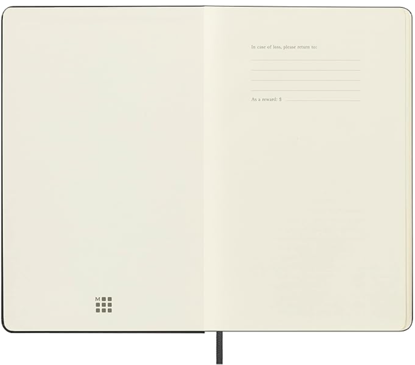 Il taccuino presenta 240 pagine con layout a pagine bianche e carta color avorio da 70 g/m² senza cloro e l'etichetta "In case of loss" per segnare i tuoi contatti qualora perdessi il tuo taccuino.