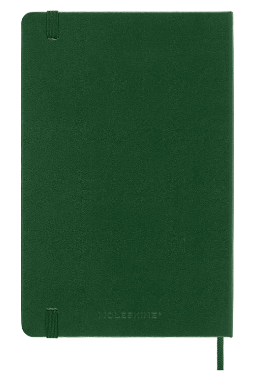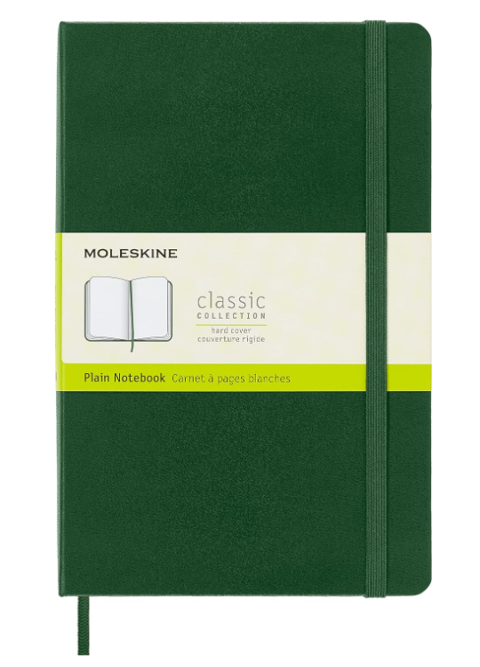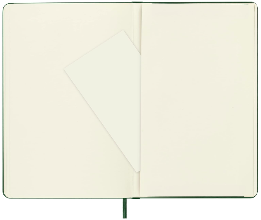 La confezione contiene un taccuino con pagine bianche e copertina rigida, disponibile nel formato Large 13 x 21 cm da 240 pagine e nel colore Verde Mirto.