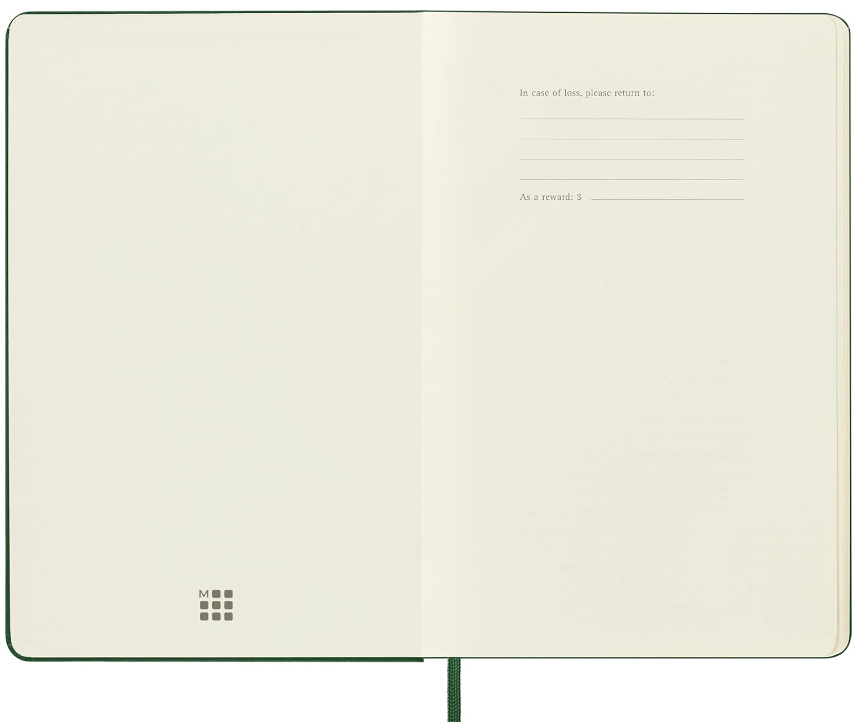 Il taccuino presenta 240 pagine con layout a pagine bianche e carta color avorio da 70 g/m² senza cloro e l'iconica etichetta "In case of loss" per segnare i tuoi contatti qualora perdessi il tuo taccuino.