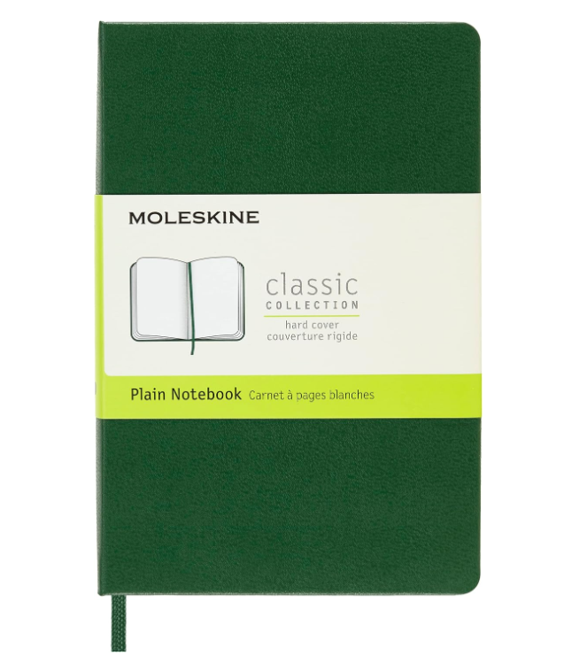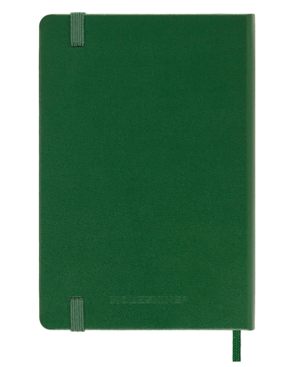 La confezione contiene un taccuino con pagine bianche e copertina rigida, disponibile nel formato Pocket 9 x 14 cm da 192 pagine e nel colore Verde Mirto.
