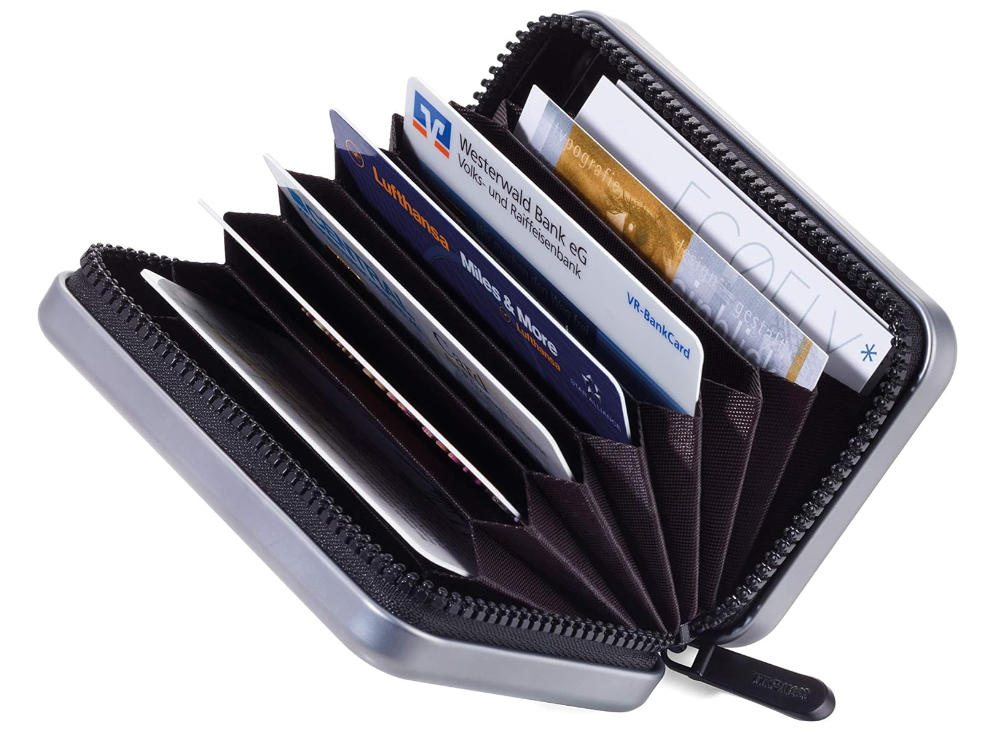 I 9 scomparti offrono spazio per circa 20 carte, denaro e ricevute. La custodia per carte di credito si presenta nel design di una valigetta rigida. Ideali da regalare ai viaggiatori.