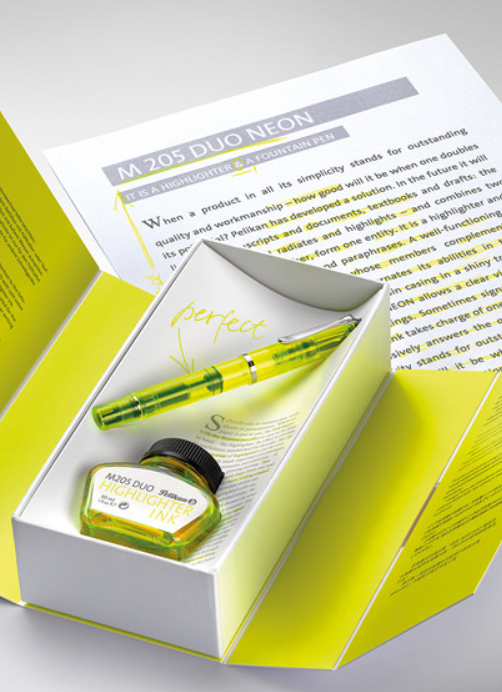Racchiuso in una confezione regalo appositamente progettata insieme a una bottiglia di inchiostro evidenziatore al neon vibrante.