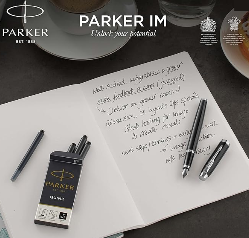 La penna a sfera è dotata di meccanismo a scatto e ricarica Quinkflow blu per garantire una scrittura perfetta e affidabile, ma è possibile utilizzare anche le ricariche gel Parker Quink.