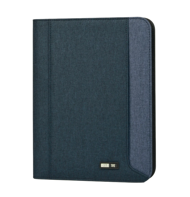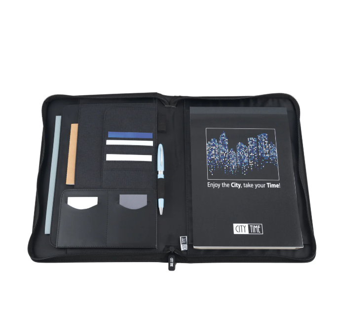 Portablocco in tessuto tecnico bicolore. Formato A4, chiusura con zip, scomparti per biglietti, tasca interna portadocumenti, portapenna, completo di blocco. Dimensioni 26x34cm. Utile per professionisti o per il viaggio.