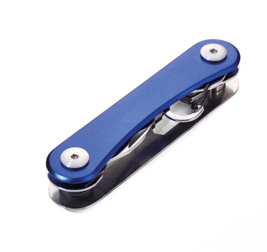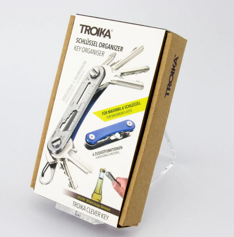TROIKA CLEVER KEY Organizer per chiavi per un massimo di 6 chiavi con 6 funzioni aggiuntive: apribottiglie, moschettone per aggancio alla borsa o al passante per cintura, chiave inglese (4 misure), cacciavite a taglio, utensile per viti ad alette, righello cm/pollici, incl. custodia per cintura. Troika Clever Key include un pratico attacco per la chiave della tua auto. Troika Clever Key ha un robusto alloggiamento in alluminio e acciaio inossidabile ed è disponibile in argento opaco/titanio o piastra posteriore blu, entrambe con piastra anteriore cromata.