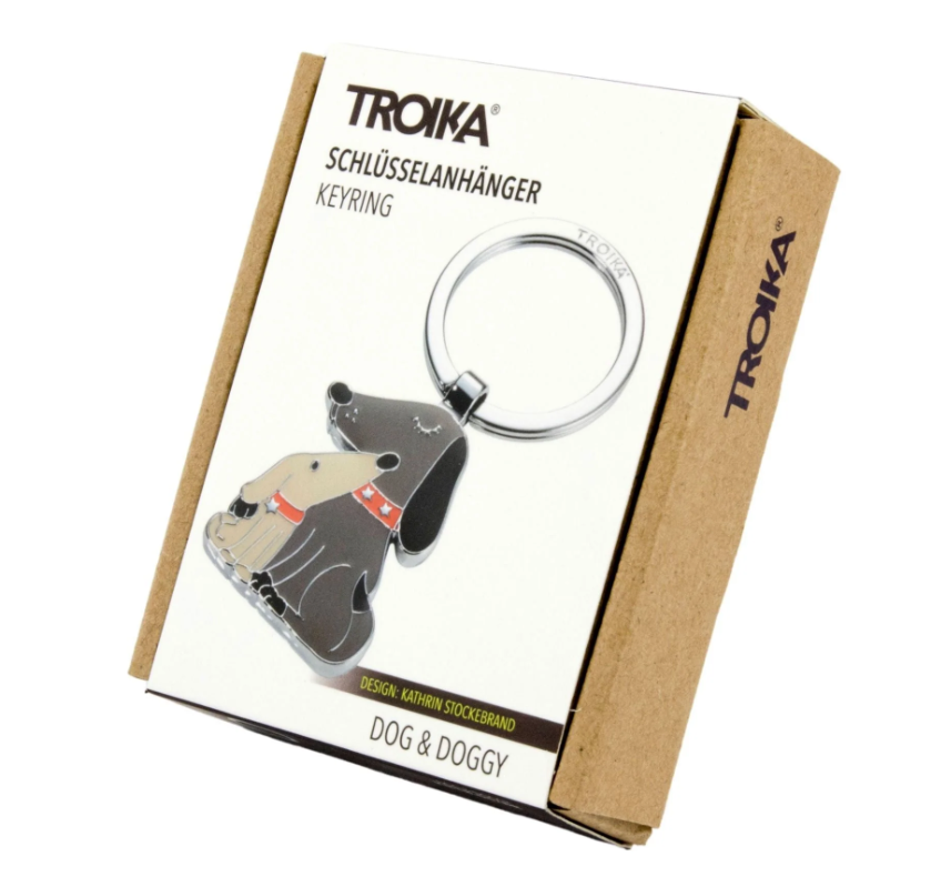 Il portachiavi Dog di Troika presenta un ciondolo raffigurante una mamma cagnolina con il suo cucciolo in smalto e cromo. Il ciondolo del cane con cucciolo è appeso a un anello diviso in cromo lucido. Il ciondolo ha una palpebra scintillante: un portachiavi di alta qualità per gli amanti dei cani.