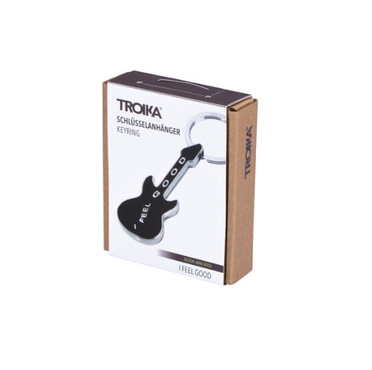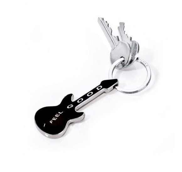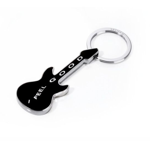 Portachiavi con scritta "I feel good", chitarra, metallo fuso/smalto, lucido, nero