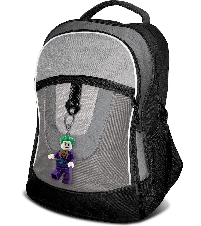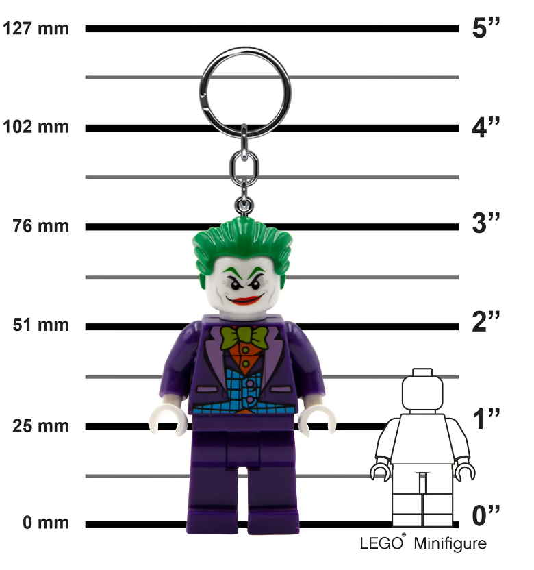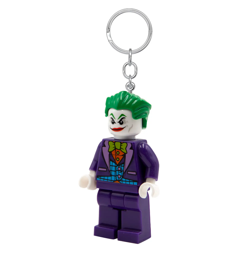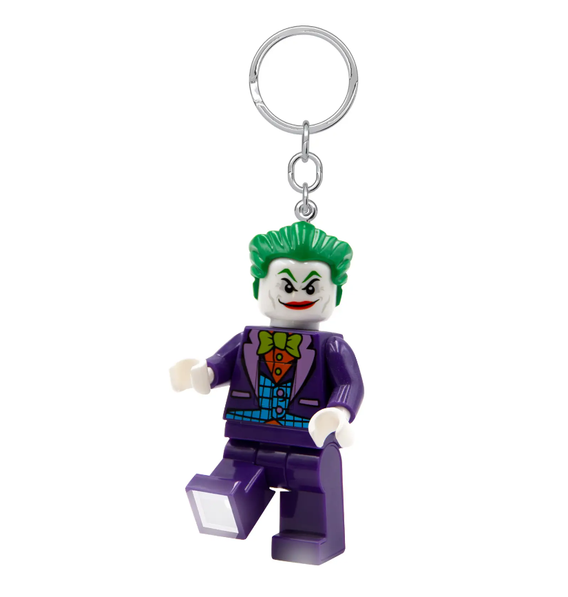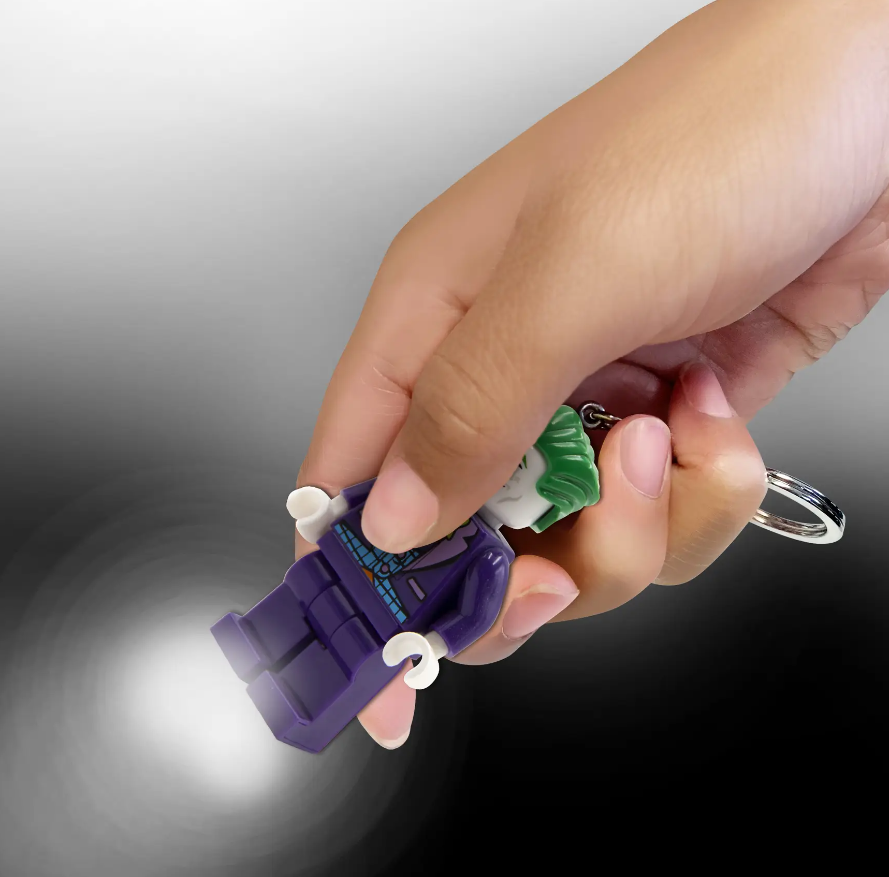 - Torcia portachiavi di The Joker™: portachiavi con grande minifigure di The Joker™ LEGO® snodabile con 2 brillanti luci a LED nei piedi, fissata a un resistente anello con catena