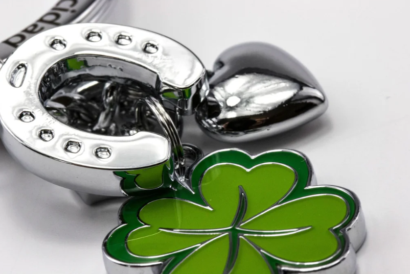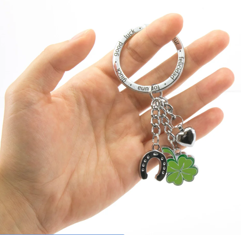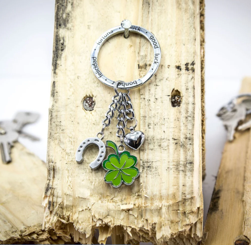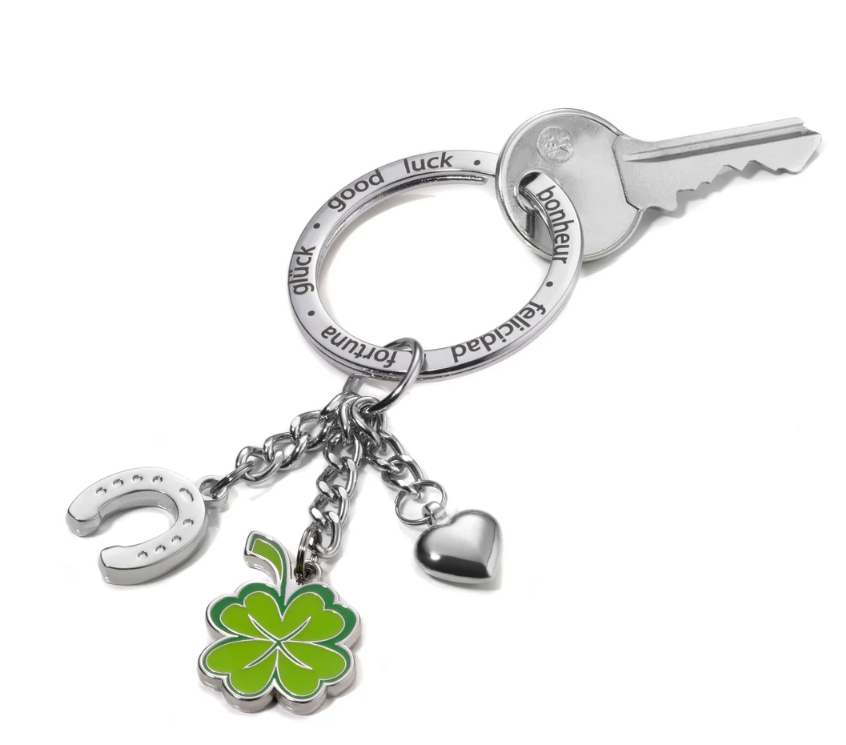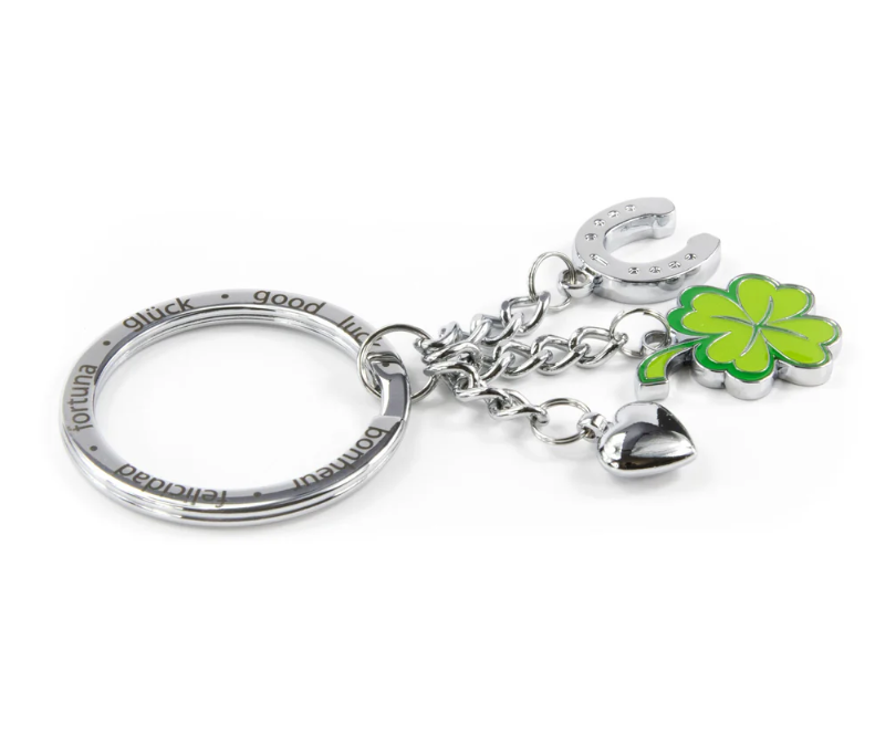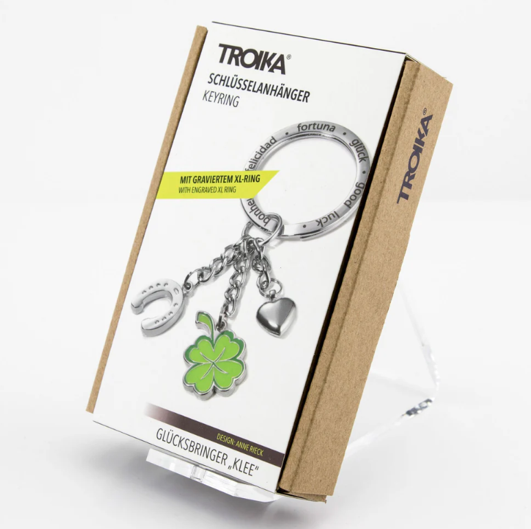 Glucksbringer Klee" (in tedesco "quadrifoglio portafortuna") di Troika è un portachiavi con ciondolo che parla di buona fortuna. Sul suo anello cromato di grandi dimensioni, è inciso "buona fortuna" in inglese, francese, spagnolo, italiano e tedesco. Dall'anello diviso pendono tre ciondoli: un ferro di cavallo, un cuore e un quadrifoglio (Shamrock). La buona fortuna abbinata all'impeccabile design e finitura del prodotto Troika rendono questo portachiavi per coloro che possono usare un po' di fortuna e per coloro che vogliono rimanere fortunati.