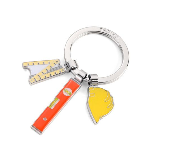 Portachiavi con 3 ciondoli, metro pieghevole, livella a bolla e casco da cantiere, metallo fuso/smalto, lucido, multicolore.