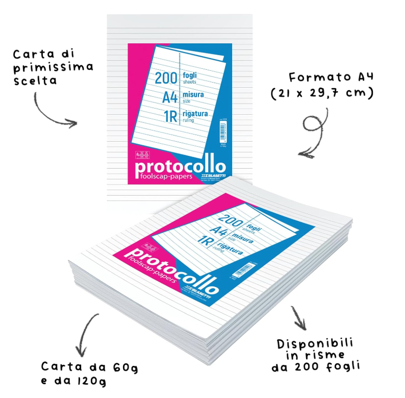Blasetti Risme Foglio Protocollo - Pacchetto da 200 fogli formato A4, per compiti in classe scuola media e superiore, per studi notarili o avvocati, Carta da 60gr - Rigatura Righe 1R.