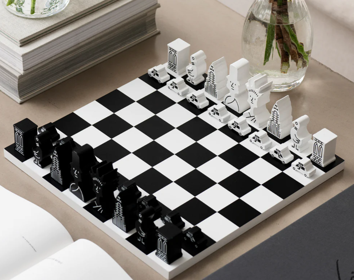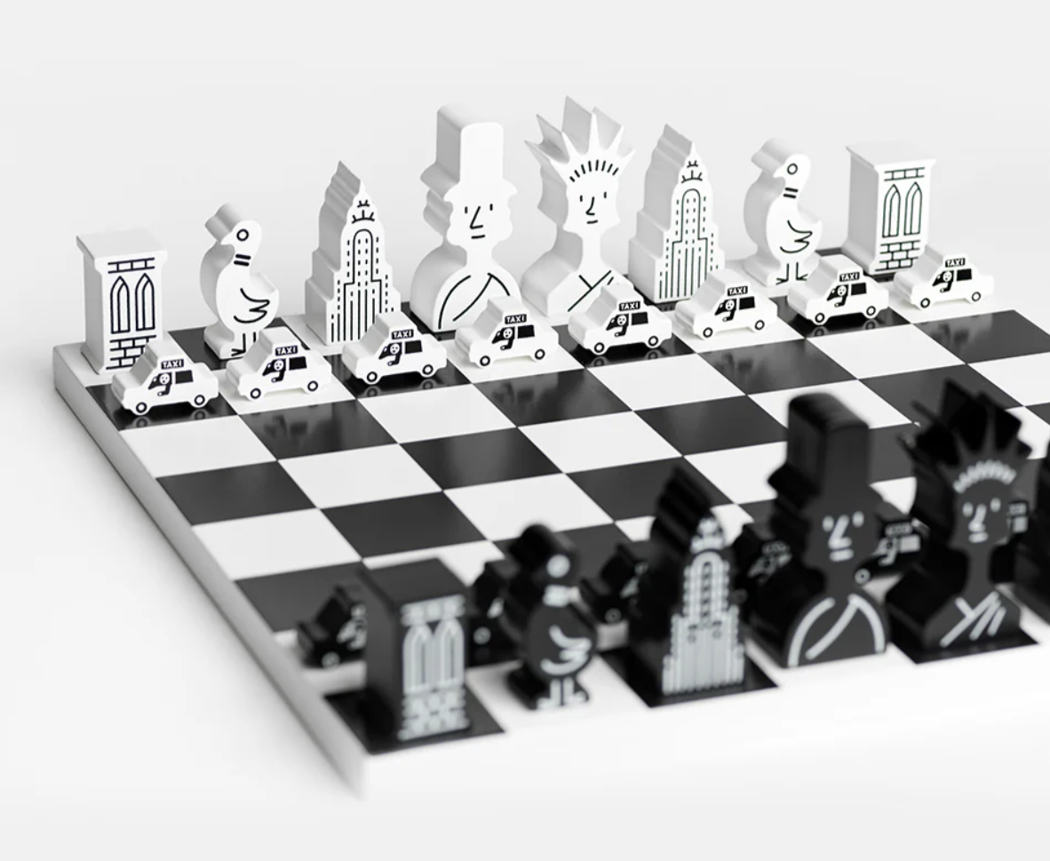 Questa edizione speciale presenta i monumenti della città come pezzi degli scacchi: dalla Statua della Libertà, sempre vigile, che funge da Regina, ai piccioni che volano come Cavalli, fino al trambusto dei taxi gialli come Pedoni. Ogni pezzo rappresenta un aspetto del carattere vibrante di New York, creando un omaggio giocoso alla città che non dorme mai. Il set di scacchi è illustrato da Christoph Niemann, collaboratore fisso del New Yorker.