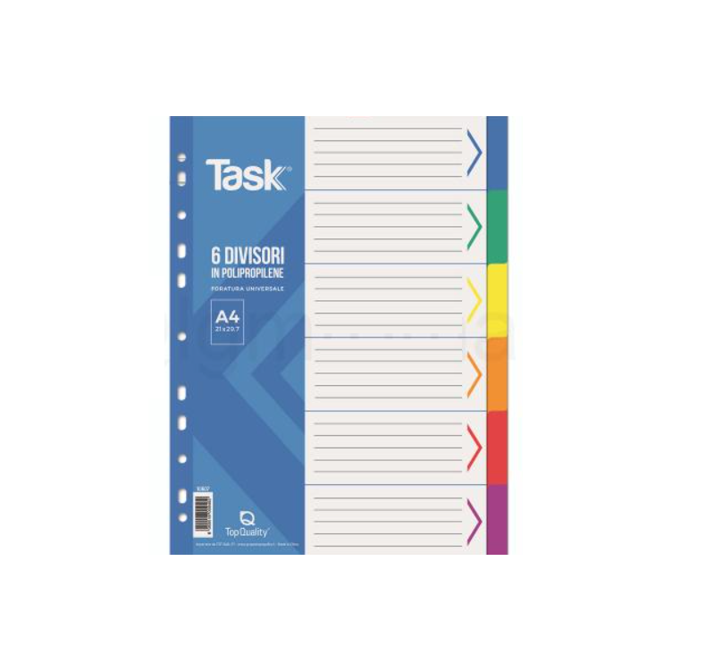 Divisori A4 in polipropilene con 6 tasti colorati per un'organizzazione efficiente dei documenti. Realizzati in PPL resistente, questi separatori garantiscono durabilità e facilità d'uso in ambito ufficio, scuola o archivio. Ideali per classificare e reperire rapidamente i contenuti nei raccoglitori standard formato A4.