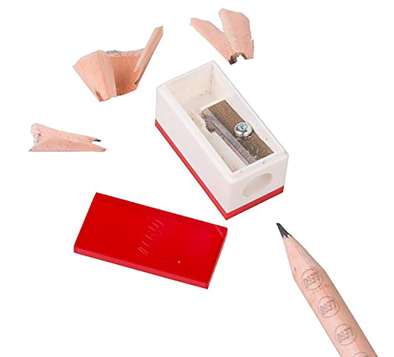 Temperino (15 x 33 x 19 mm) con una piastrina LEGO 2x4 attaccata sul fondo.