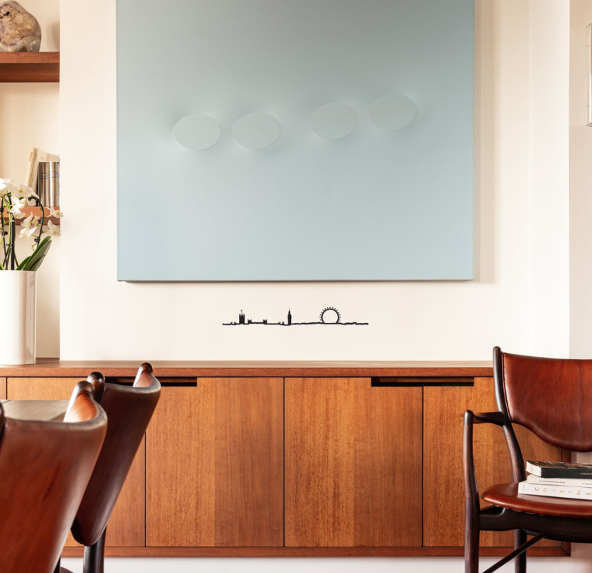 Skyline Londra in profilo di acciaio nero, dimensione 50cm. Questo pezzo decorativo riproduce la celebre sagoma della capitale britannica con dettagli architettonici riconoscibili. Costruito in acciaio robusto con finitura nera opaca, offre un'estetica minimalista e raffinata. Ideale per chi apprezza il design urbano e desidera portare l'atmosfera londinese negli spazi interni. Un'aggiunta sofisticata per collezionisti di arte contemporanea e appassionati di architettura internazionale.