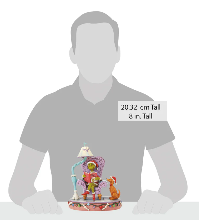 Questa statuetta raffigura il Grinch seduto comodamente su una poltrona blu e viola. Il Grinch sta leggendo il suo libro vestito da Babbo Natale. Il suo fedele cane, Max, è seduto accanto a lui. Se è troppo buio, accendete la lampada per permettere al Grinch di continuare a leggere. Jim Shore Dalla collezione Grinch, disegnata dal pluripremiato artista e scultore. Ogni statuetta è dipinta a mano e sono prevedibili leggere variazioni di colore che rendono ogni pezzo unico. Confezionato in una scatola regalo. Questi articoli non sono giocattoli per bambini. Sono destinati esclusivamente agli adulti.