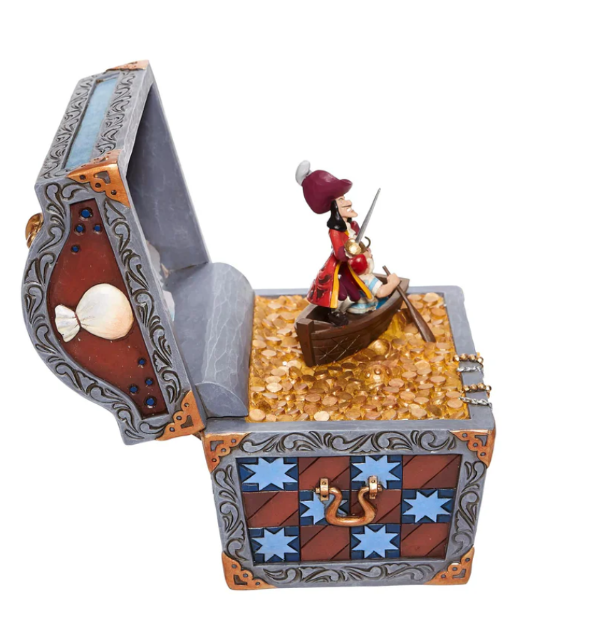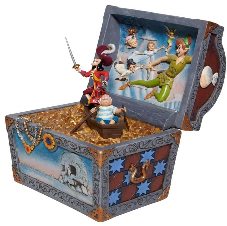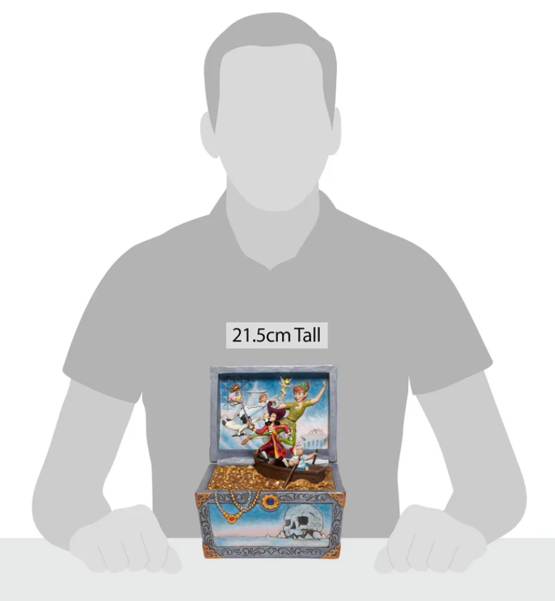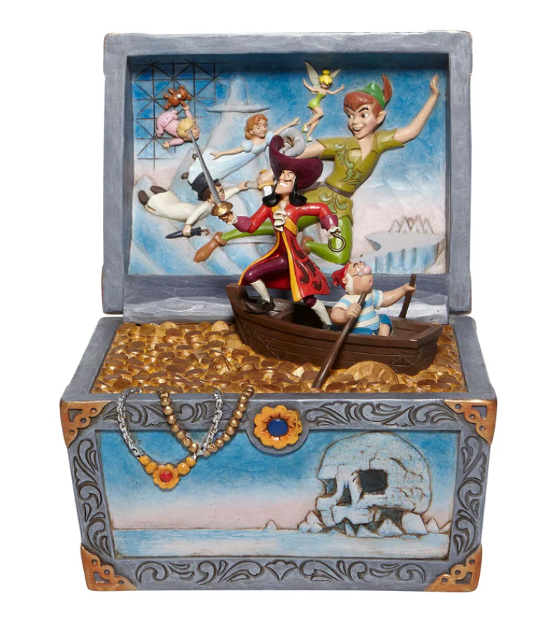 Magnifica statuetta altamente dettagliata con i nostri personaggi preferiti del film Peter Pan. Lui e i suoi amici volano allegramente mentre Capitan Uncino e il signor Spugna attraversano un mare di tesori, all'interno del forziere. La Roccia del Teschio e gli eleganti motivi decorano il forziere. Disegnato dal pluripremiato artista e scultore Jim Shore per il marchio Disney Traditions. Queste figurine non sono giocattoli per bambini. Sono destinate solo agli adulti.