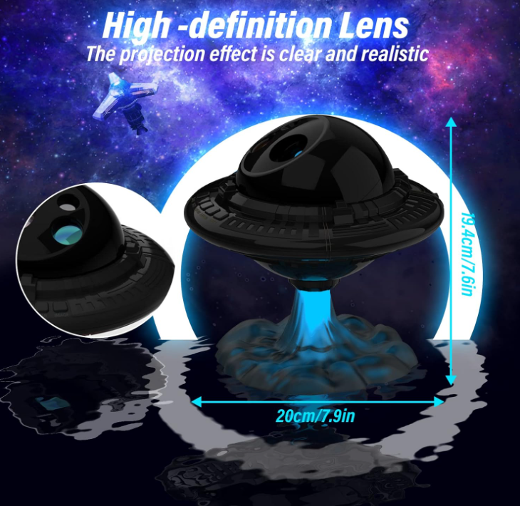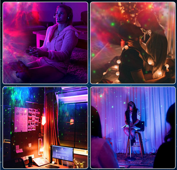 Proiettore Spazio multimodale: la combinazione di nebulosa e luce stellare può essere attivata individualmente o in combinazione ( proiezioni da sogno + colori della nebulosa + luci notturne a colori + modalità di cambiamento della respirazione stellare), con effetti di illuminazione a getto di decollo UFO, proiettando motivi spaziali, aumentando il senso del mistero. Le stelle e le galassie ad alta risoluzione possono essere proiettate su pareti e soffitti.