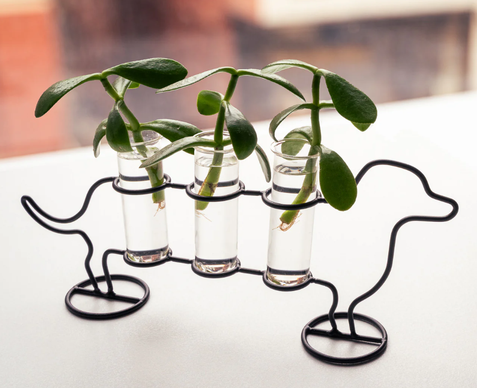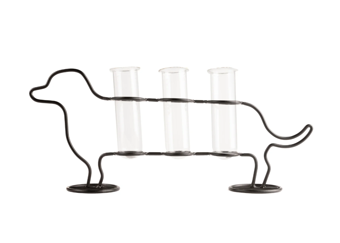L'elegante stazione di propagazione a forma di bassotto è un vero spaccacoda! Per favorire la crescita di talee e piantine o per esporre le fioriture fresche con una zampa in più.